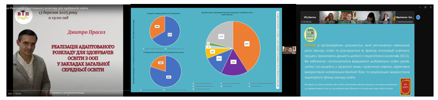 На онлайн-зустрічі слухачі отримали рекомендації щодо створення оптимального навчального середовища для дітей з особливими освітніми потребами, де було наголошено, що створення адаптованого розкладу – це спільна робота педагогів, батьків та фахівців. Лише спільними зусиллями ми можемо забезпечити кожній дитині з ООП можливість розкрити свій потенціал та досягти успіху.